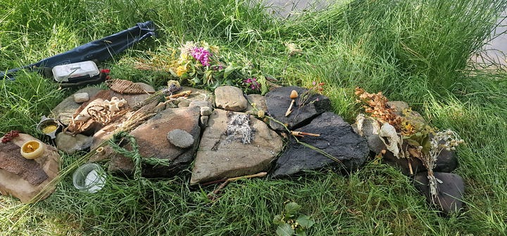After washing and tidying ourselves up as if we were going on a date, we walked in procession to a tucked-away spot along the Farrar. Aoife had arranged river stones into the shape of a salmon. This would be our altar. After her invocations, we each introduced ourselves to the river and offered blessings.